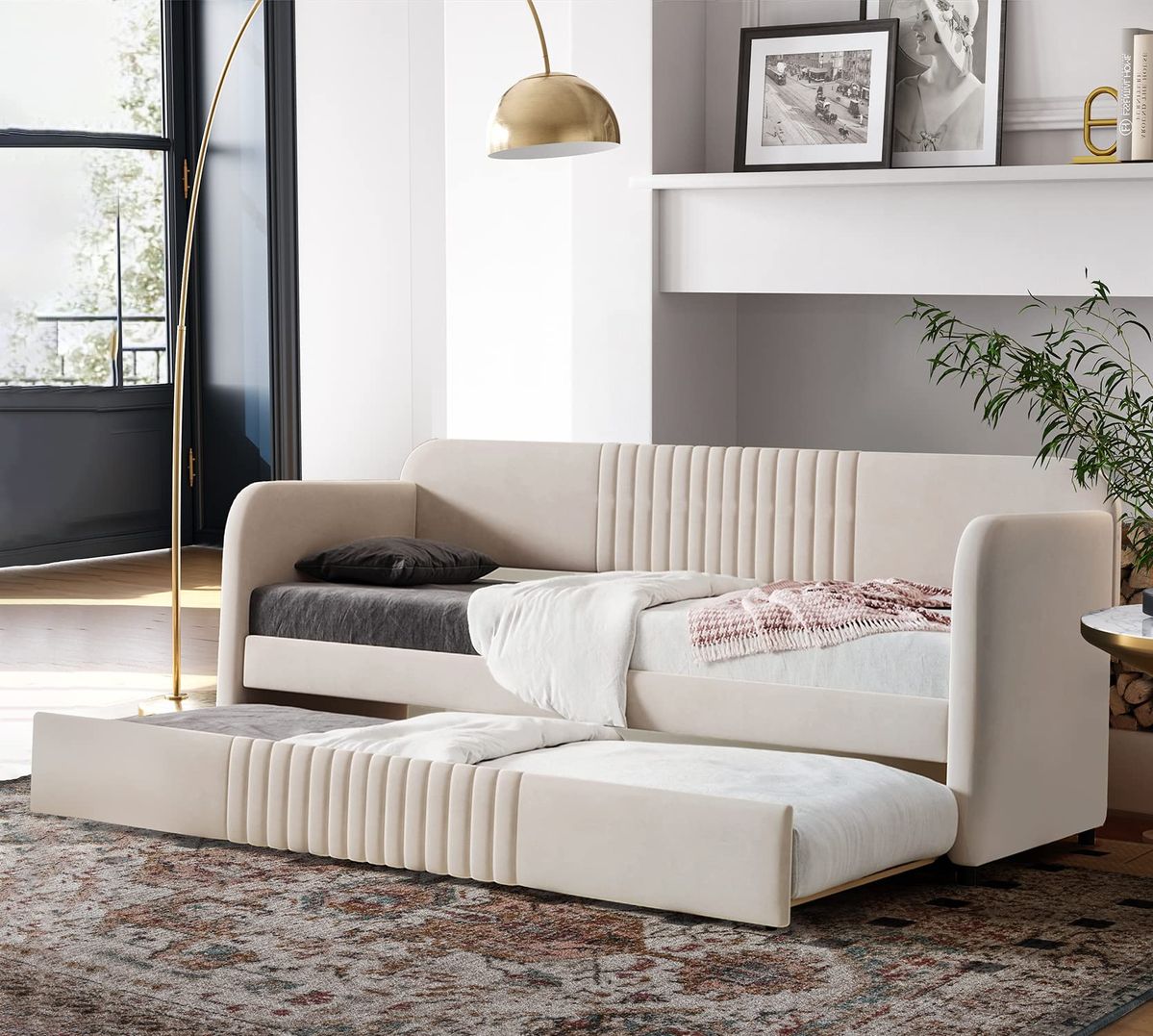 Upgrade your guest room or cozy bedroom with this modern upholstered daybed featuring a smooth velvet finish and stylish vertical line design. The pull-out trundle provides an additional sleeping space, making it perfect for sleepovers, kids’ rooms, or visiting guests. Designed to fit small to large rooms effortlessly while delivering premium comfort and elegant aesthetics.